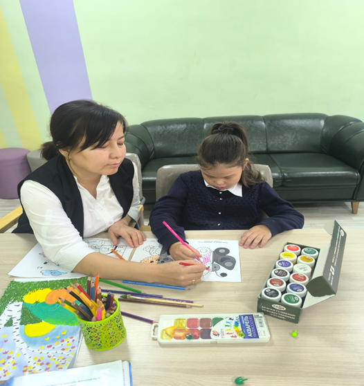 Педагог-ассистент проводит индивидуальное занятие с ученицей 4 класса. Деятельность направлена на развитие творческих способностей, мелкой моторики и внимания через рисование и раскрашивание.Педагог-ассистент 4-сынып оқушысымен жеке сабақ өткізуде. Іс-әрекет сурет салу және бояу арқылы оқушының шығармашылық қабілеттерін, ұсақ моторикасын және зейінін дамытуға бағытталған.