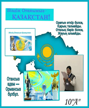 В КГУ “ОШ 193” Классными руководителями были проведены единые республиканские классные часы «Моя Родина-Казахстан», посвященный Дню Республики Казахстан, целью которой является формирование у учащихся гражданско - патриотического сознания, духовно- нравственных ценностей гражданина Казахстан.