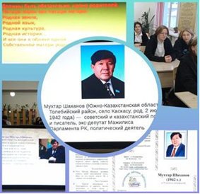 Қазақ поэзиясында өзіндік орны бар Мұхтар Шахановтың өмірі мен шығармашылығы туралы мағлұмат бере отырып, жырларының құдіретін сезіну, тіл шырайын таныту, тарихи шындықты, сөз өнерімен өрнектелген әсемдікті түйсіне білуге баулу; Адамгершілік, рухани қасиеттерді оқушылар бойына сіңіру, отансүйгіштік сезімдерін шыңдау мақсатта ақын Мұхтар Шахановтың 80 жылдығына арналған «Ұлт тілін ұлықтаған» атты 1-11 сыныптарда рухани сабақ өтілді.