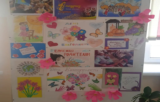 Балалардың «сыйластық» құндылығы туралы түсініктерін кеңейту. Ризашылық пен алғыс туралы түсінік беру; Үлкен — кішіге деген сүйіспеншілігін, сыпайылық қарым — қатынасын дамыту; Әдептілікке, кішіпейілділікке, ізеттілікке тәрбиелеу мақсатта «Алғыс айту күні» тақырыбында стенд жасалды.