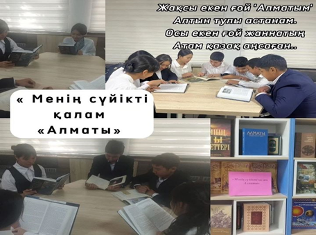Оқушыларға Алматы қаласының тарихы жайында түсінік беру. Оқушылардың танымын, ойын, тілін дамыту. Өз пікірлерін ашық айтып, өзгелердің пікірімен санаса білуге дағдыландыру. Сөйлеу шеберлігін, мәдениетін, сөздік қорын байыту. Өз елін, жерін сүйетін, өз елінің қалаларының өркендеуіне үлес қосатын азамат етіп тәрбиелеу мақсатында «Менің сүйікті қалам-Алматы» атты мектеп кітапхашысы Самижан Г.С. ұйымдастыруымен кітап көрмесі өткізілді.