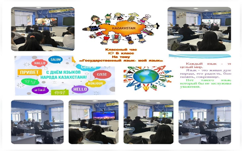 Оқушыларға мемлекеттік тілдің өркендеп, оянуына, мемлекеттік тілімізді сүюге, мемлекеттік тілді аяққа баспай, мәртебесін биік ұстау жөнінде, әр ұлттың өзіндік ерекшеліктері, салт-дәстүрі, діні, тіл ерекшелігі болатынын түсіндіру. Оқушылардың ой-өрісін, дүниетанымын кеңейту, сөздік қорын молайту, жұрт алдында еркін ауыз екі сөйлеуге баулу мақсатында 10 "Б" сыныбында "Мемлекеттік тіл-менің тілім" атты сынып сағаты өтілді.